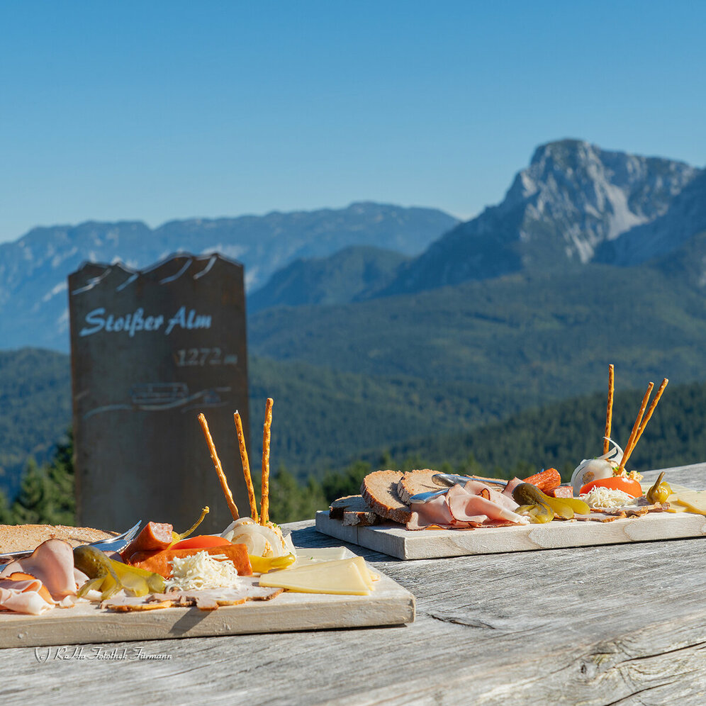 Sennerinnen verwöhnen mit bayerischen Schmankerln. Urige Räumlichkeiten und der großzügige Platz vor der Alm bieten sich für kleine und größere Feierlichkeiten an.
